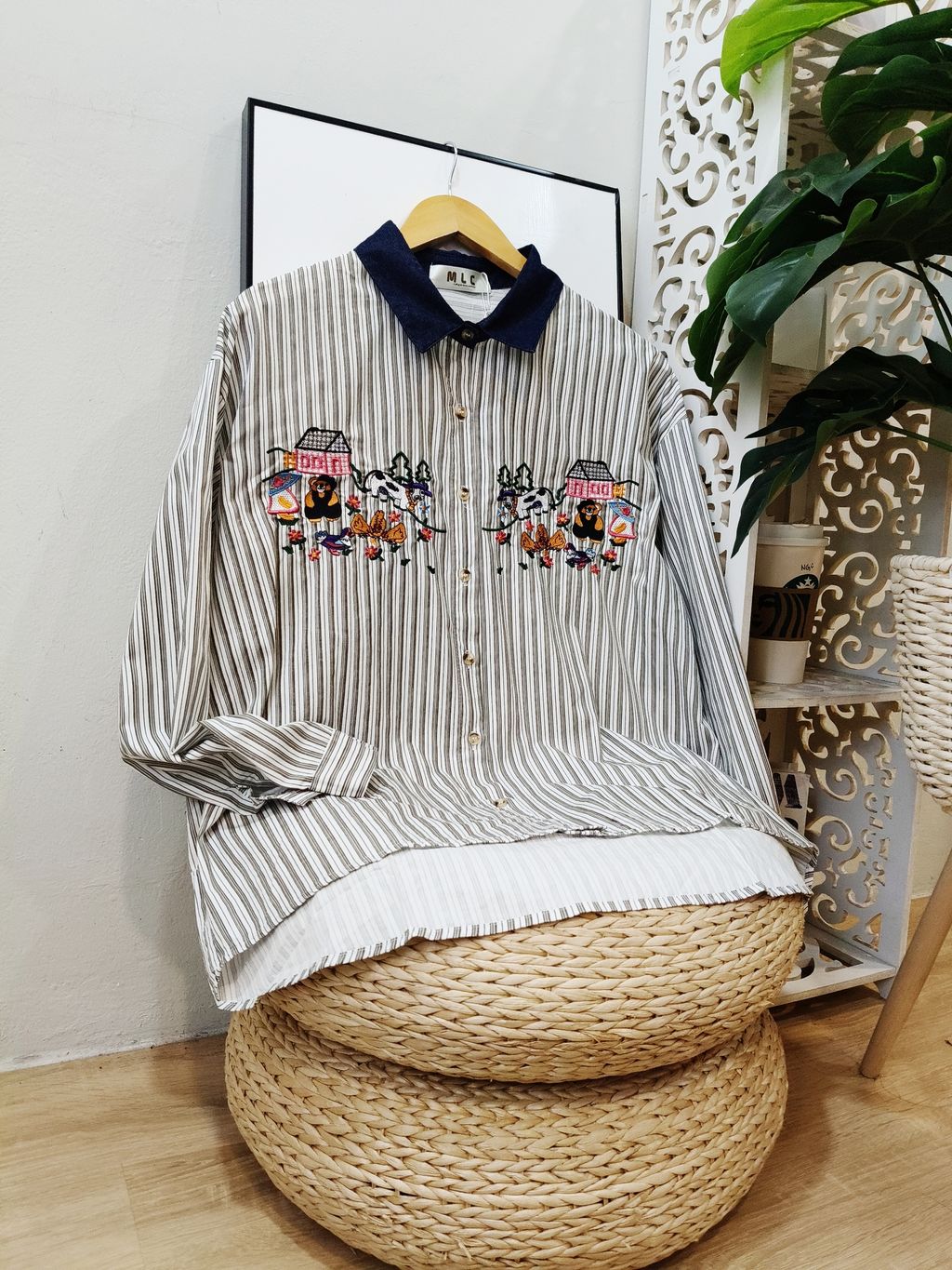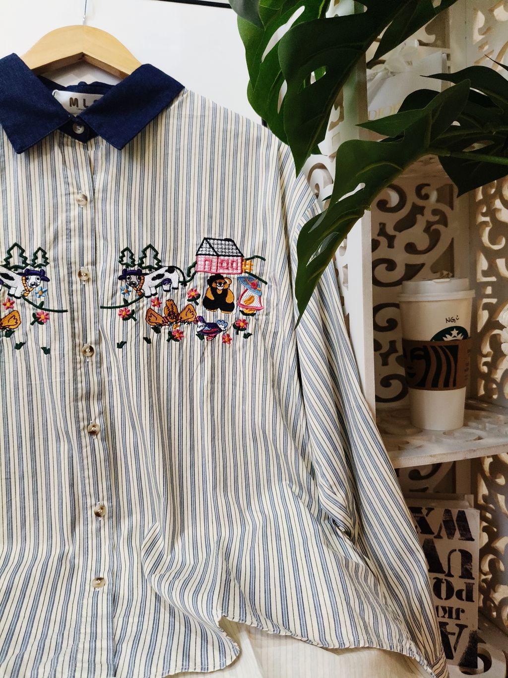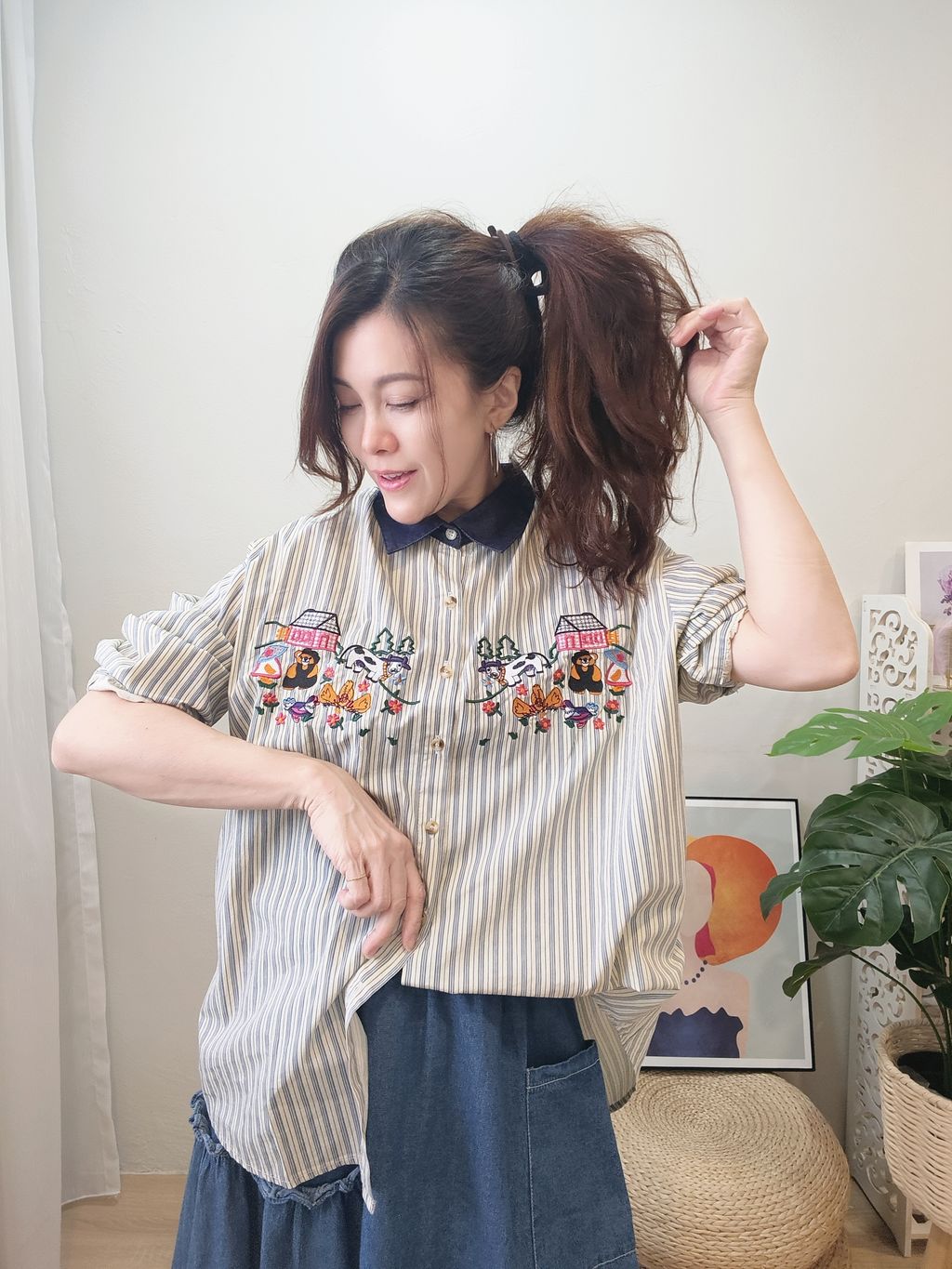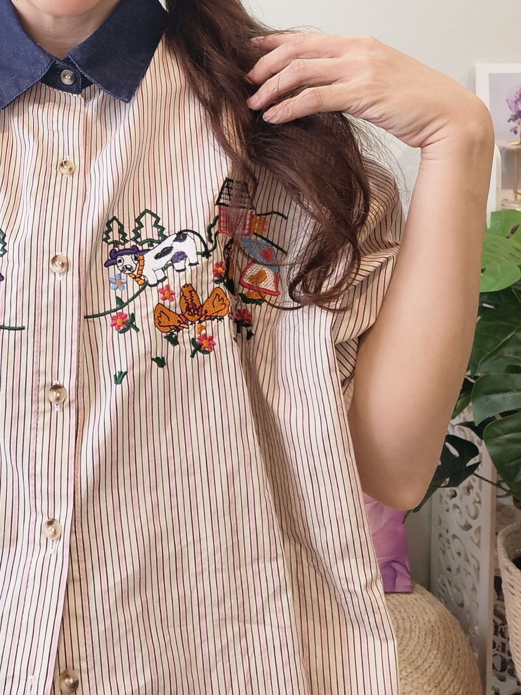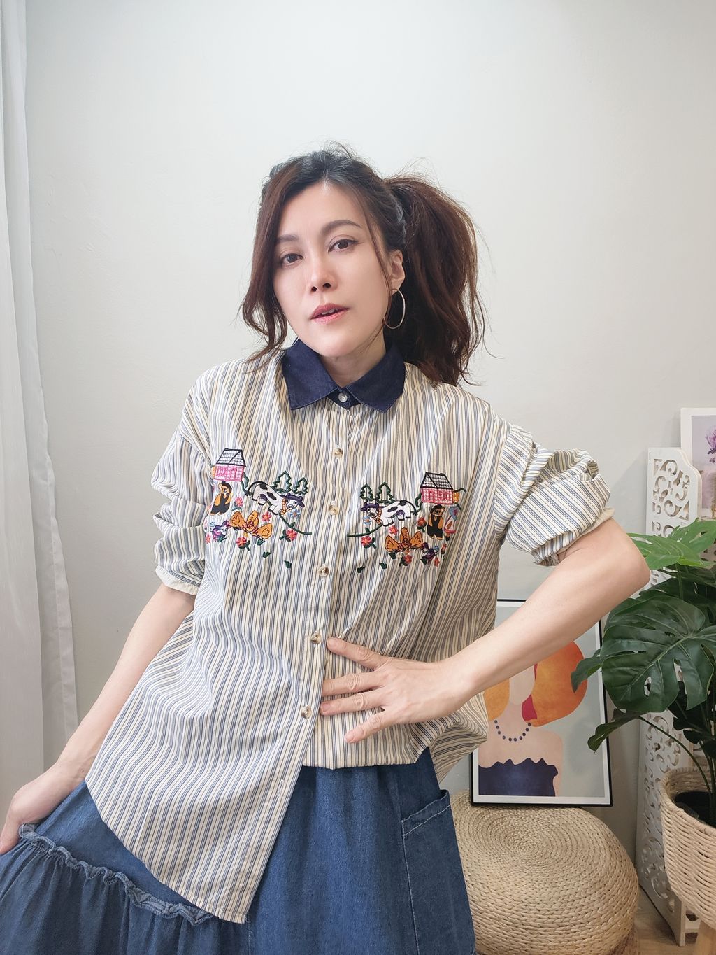 Embroidered Striped Patchwork Denim Collar Shirt 刺绣条纹拼接牛仔领口衬衫
