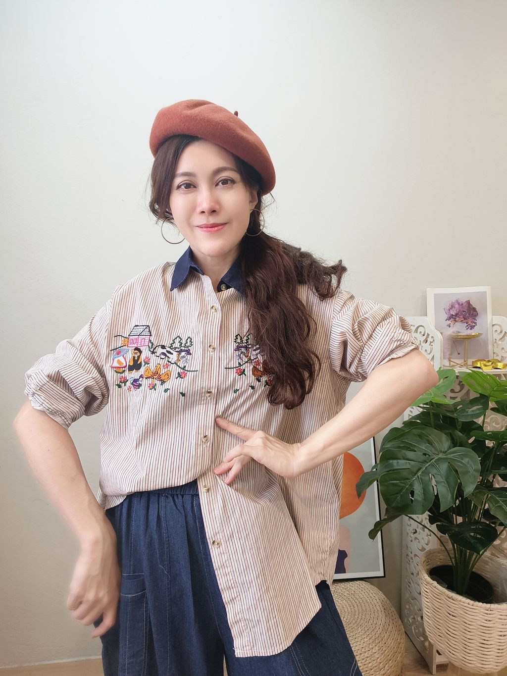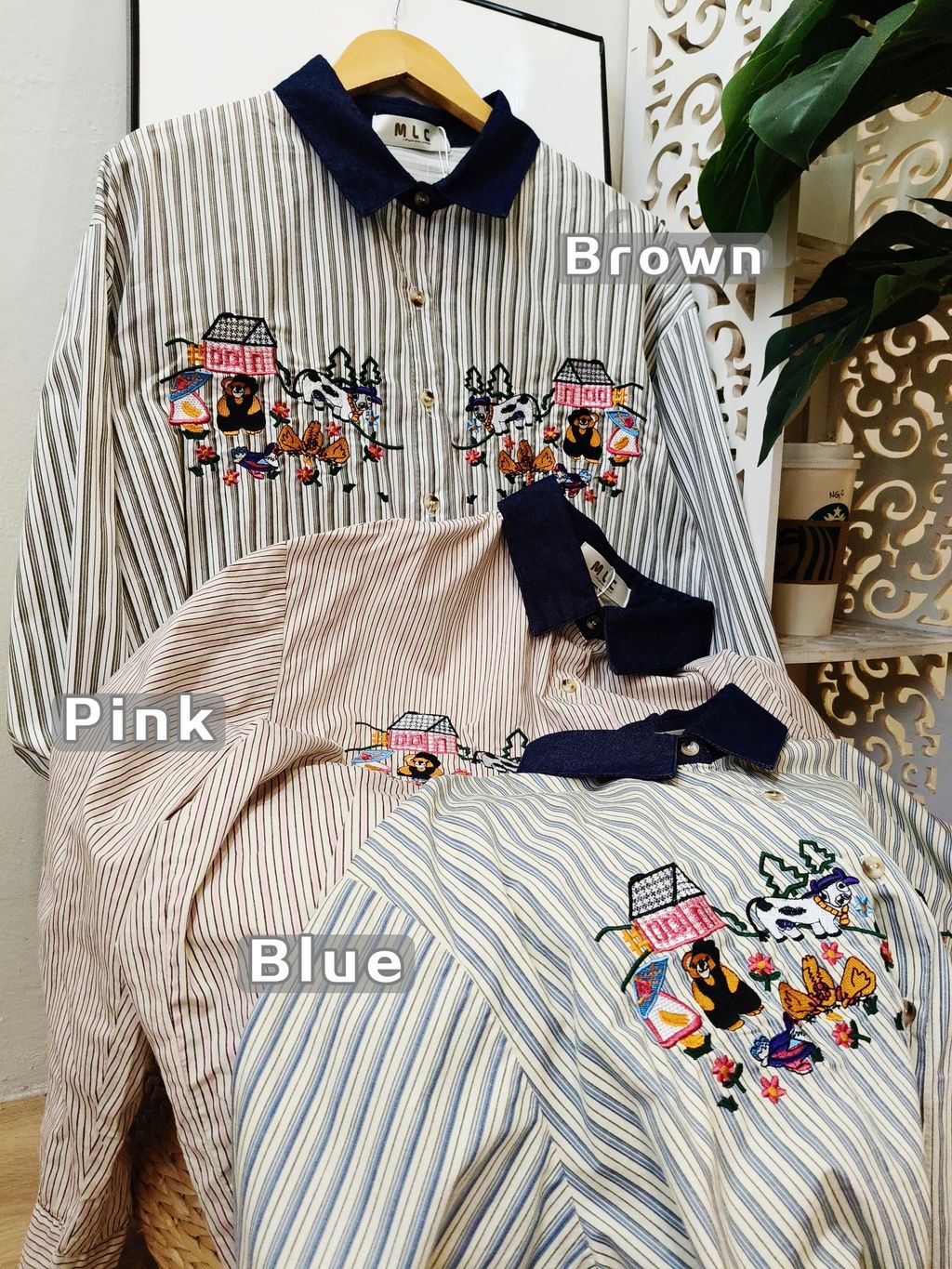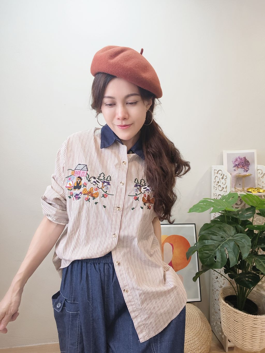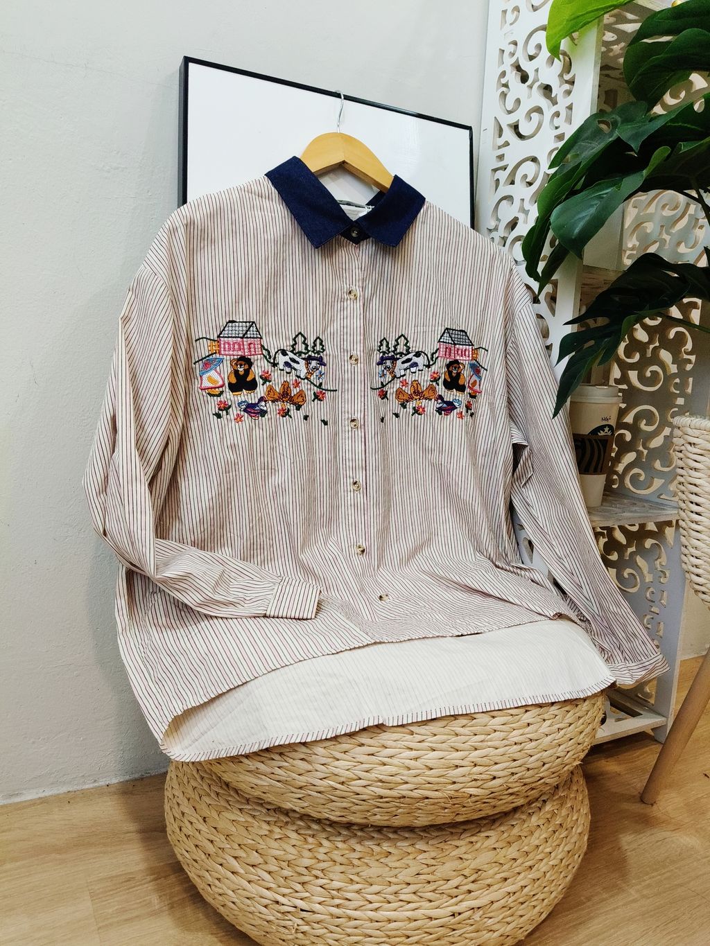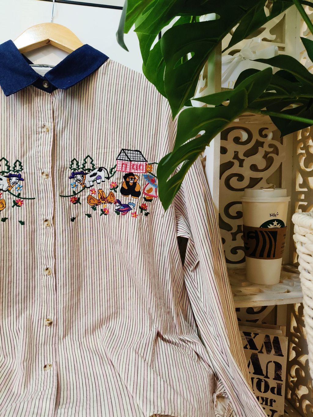 Embroidered Striped Patchwork Denim Collar Shirt 刺绣条纹拼接牛仔领口衬衫