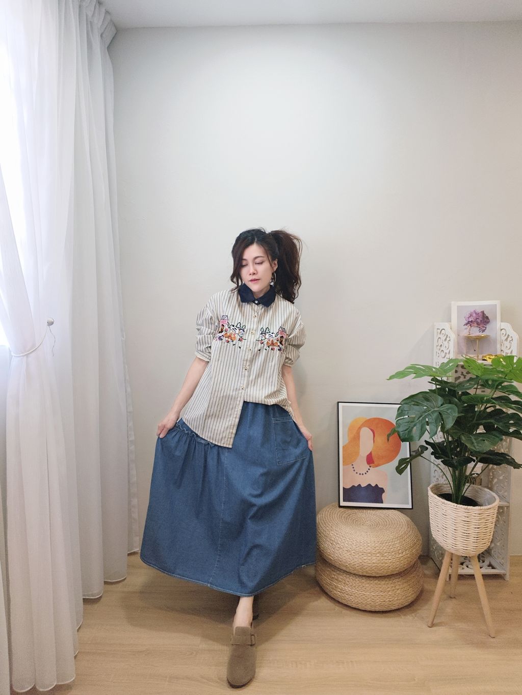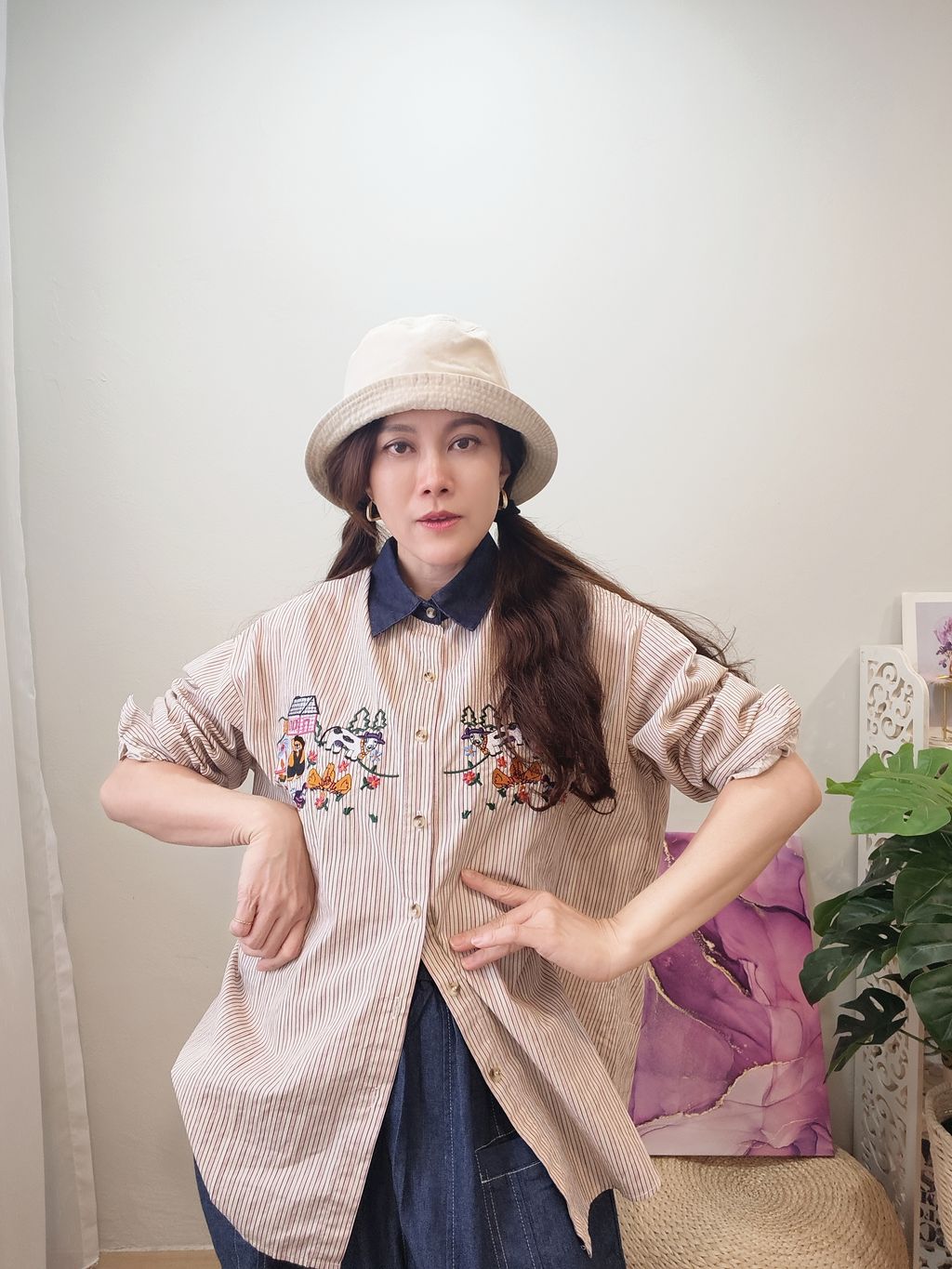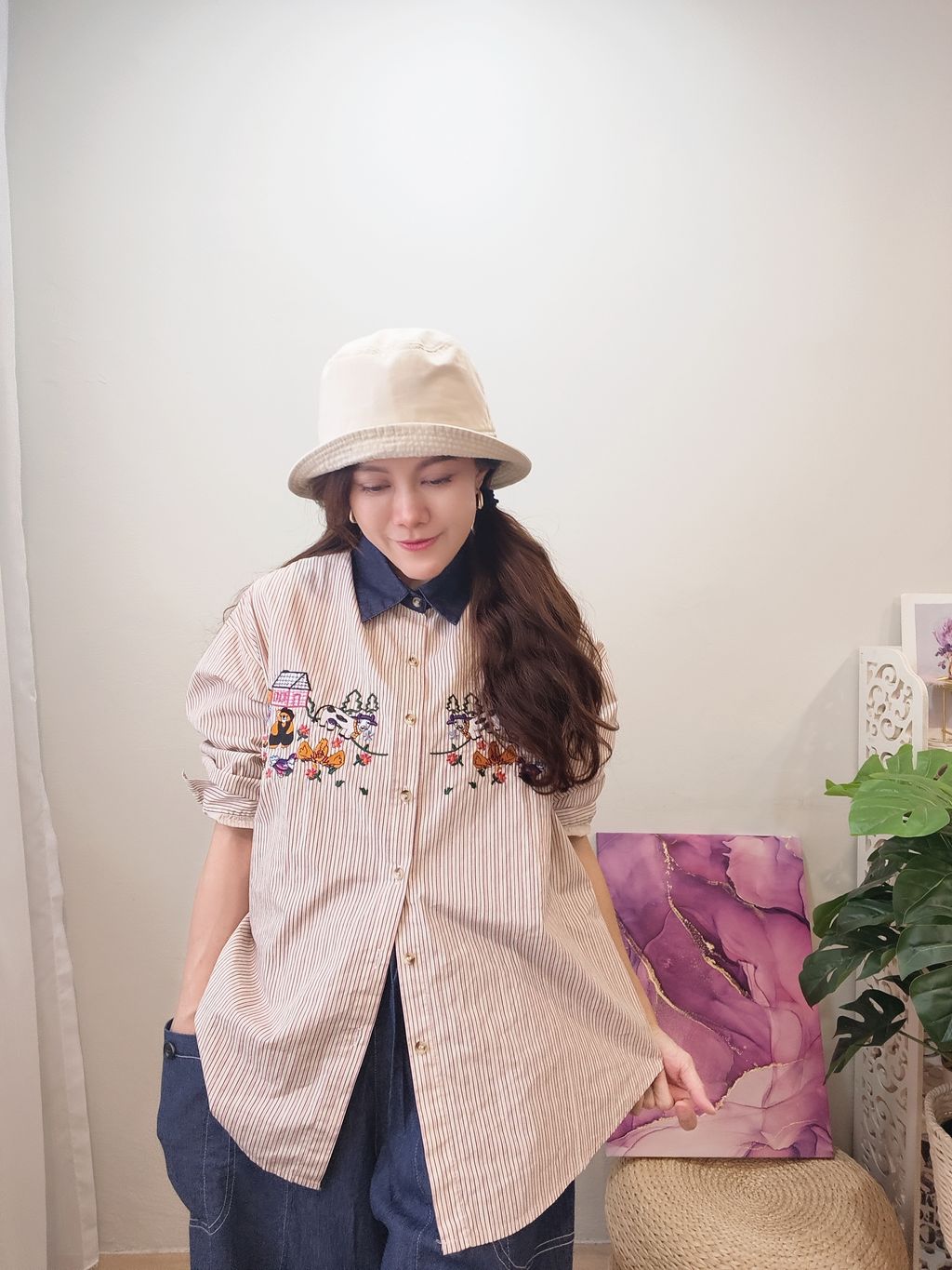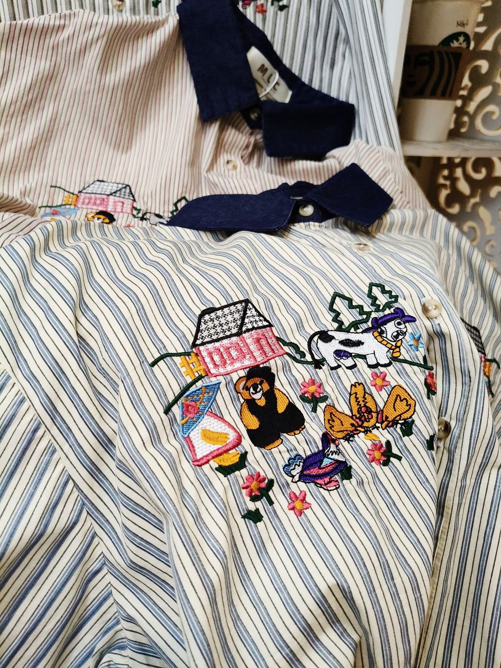 Embroidered Striped Patchwork Denim Collar Shirt 刺绣条纹拼接牛仔领口衬衫