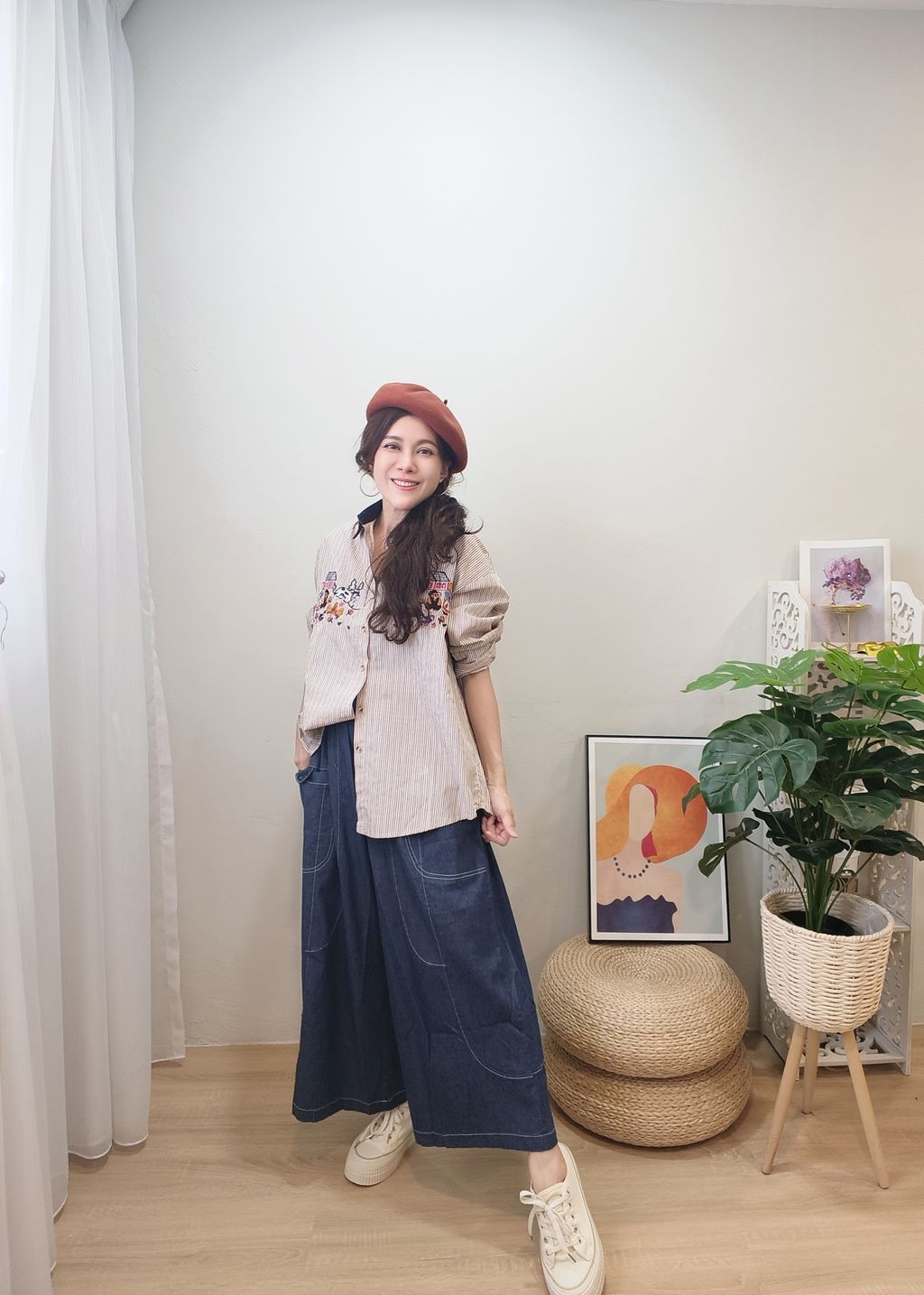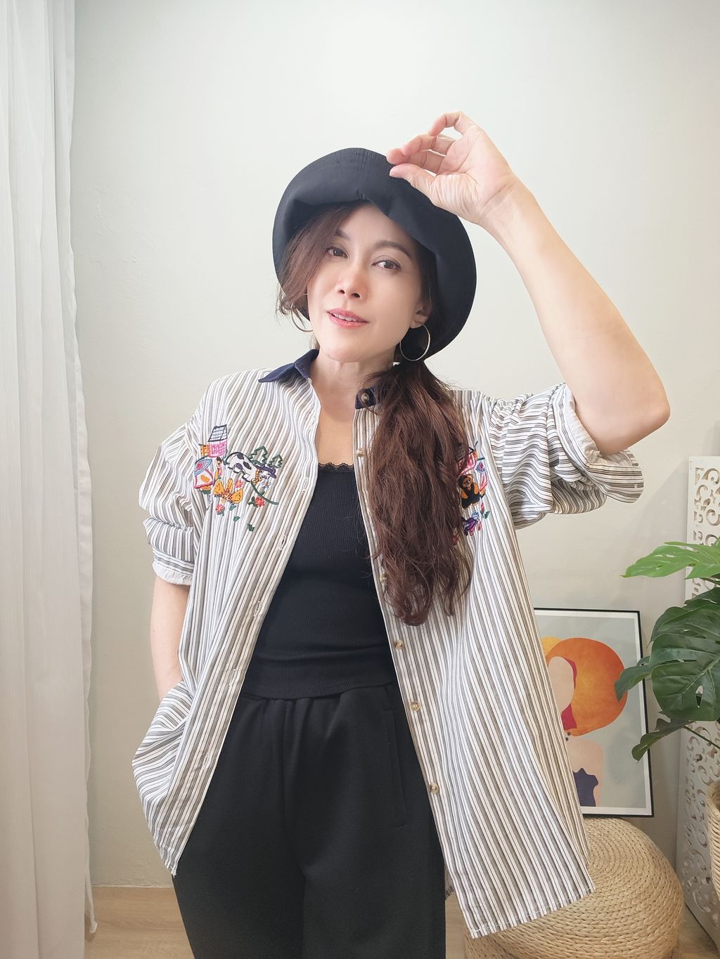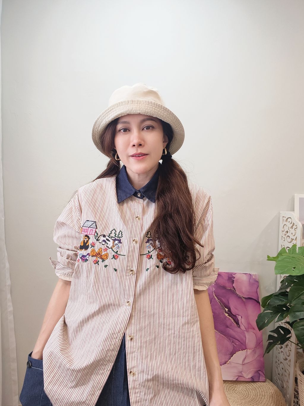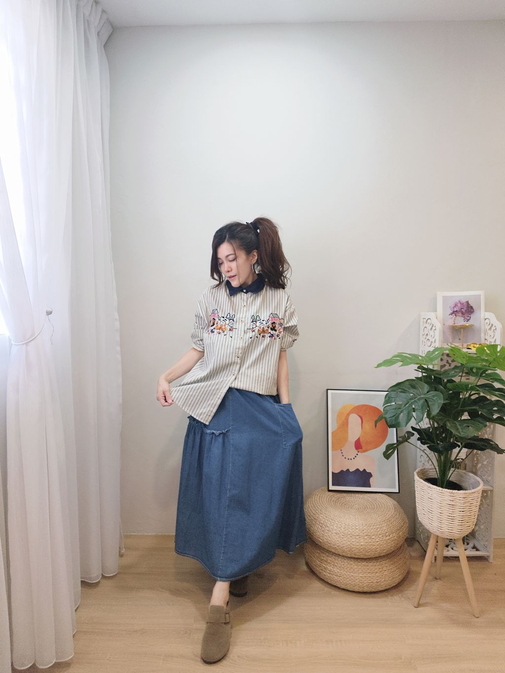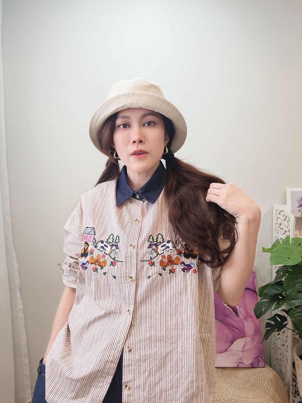 Embroidered Striped Patchwork Denim Collar Shirt 刺绣条纹拼接牛仔领口衬衫