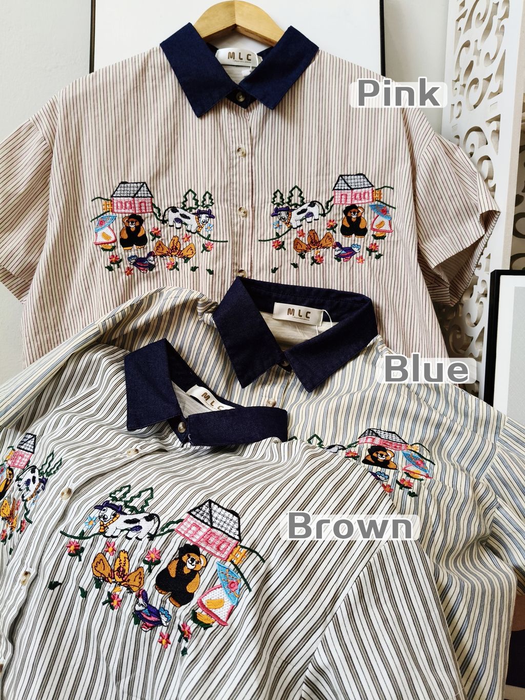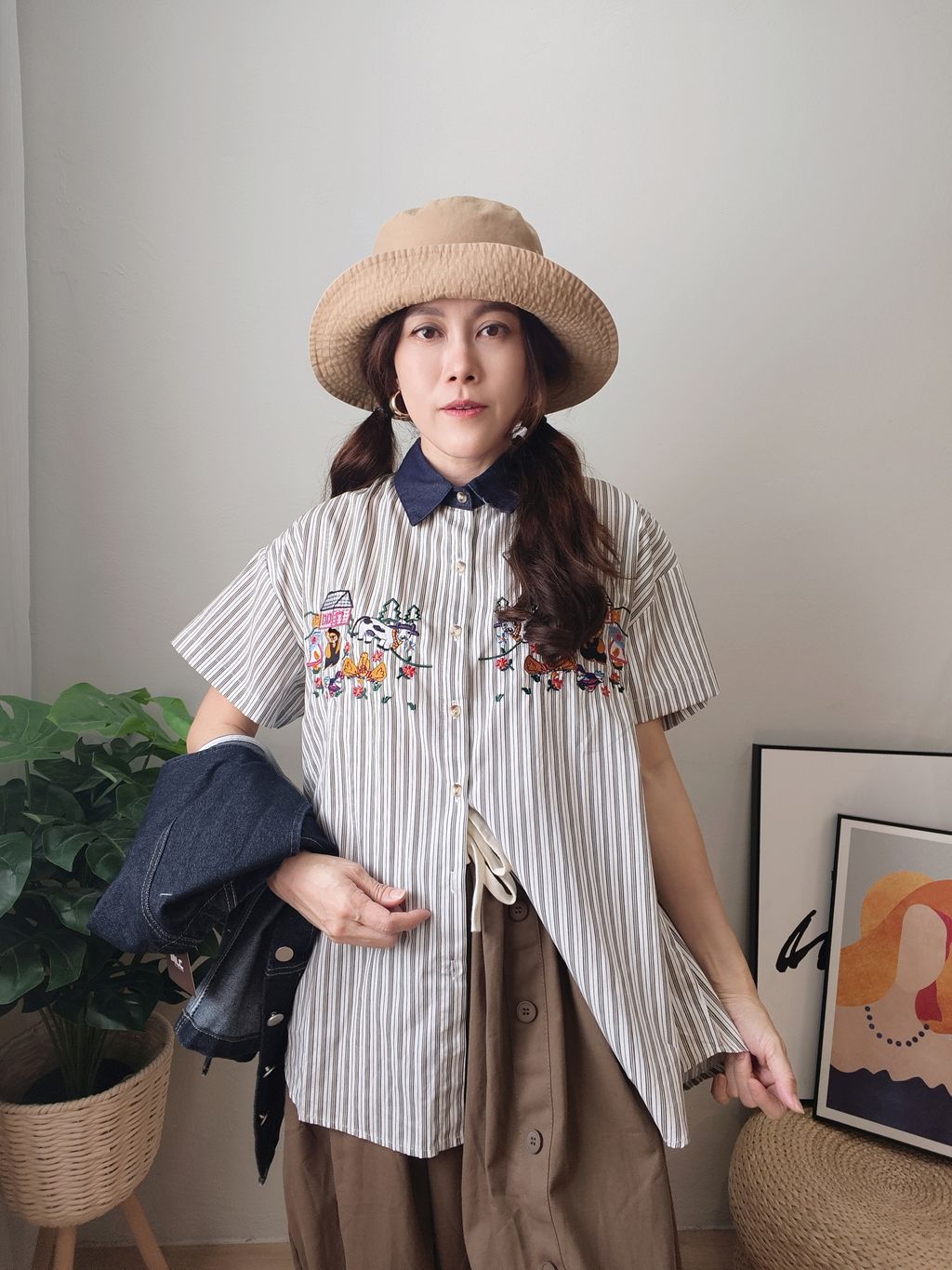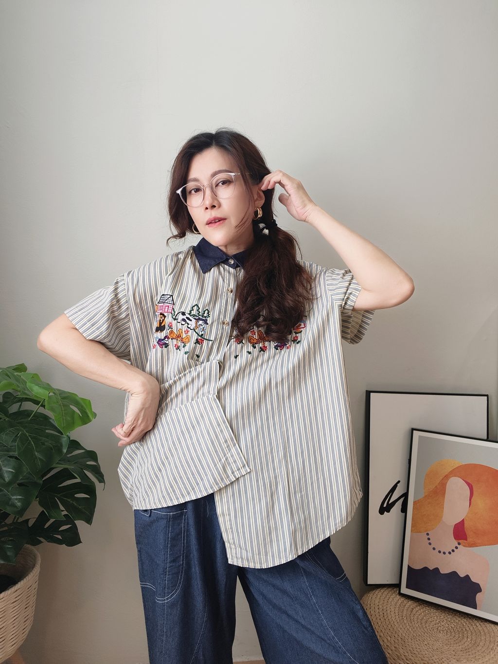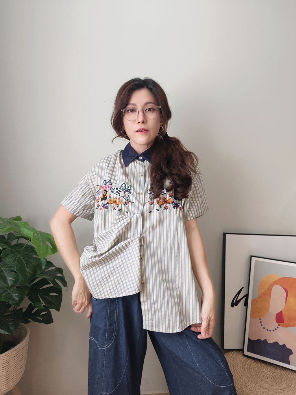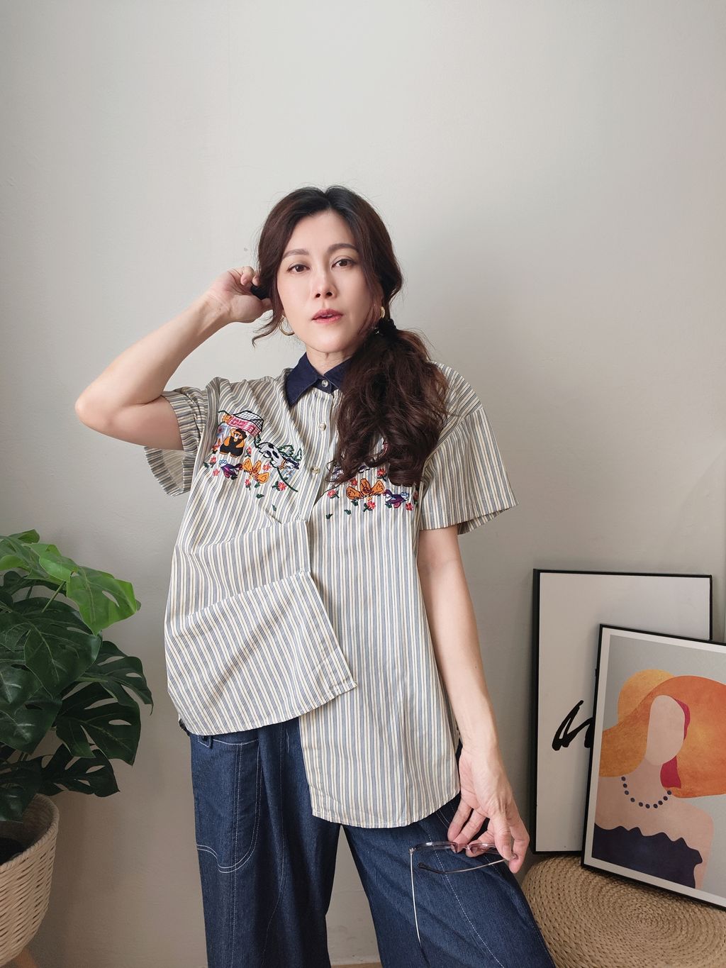 Embroidered Striped Patchwork Denim Collar Shirt 刺绣条纹拼接牛仔领口衬衫