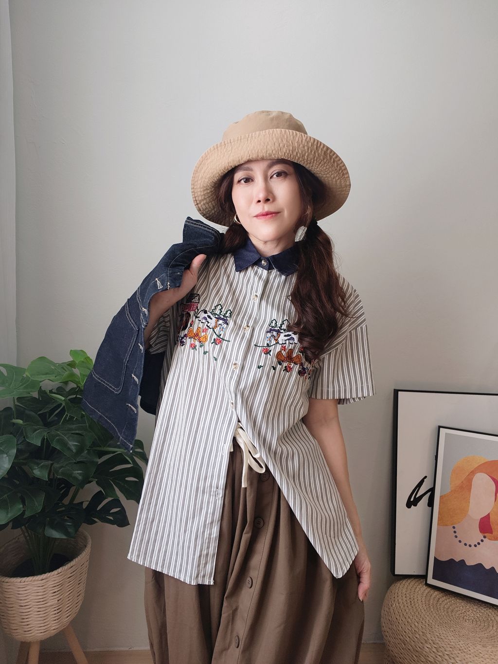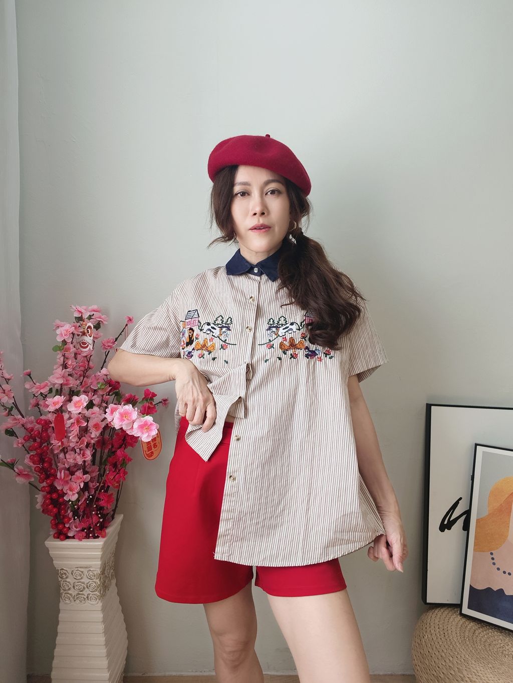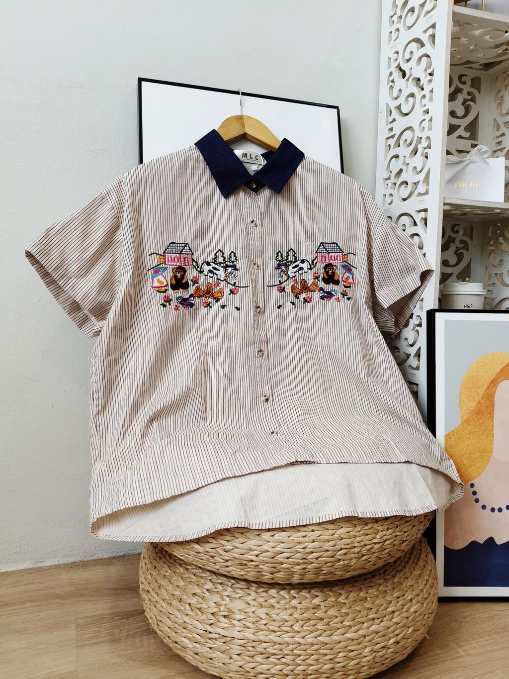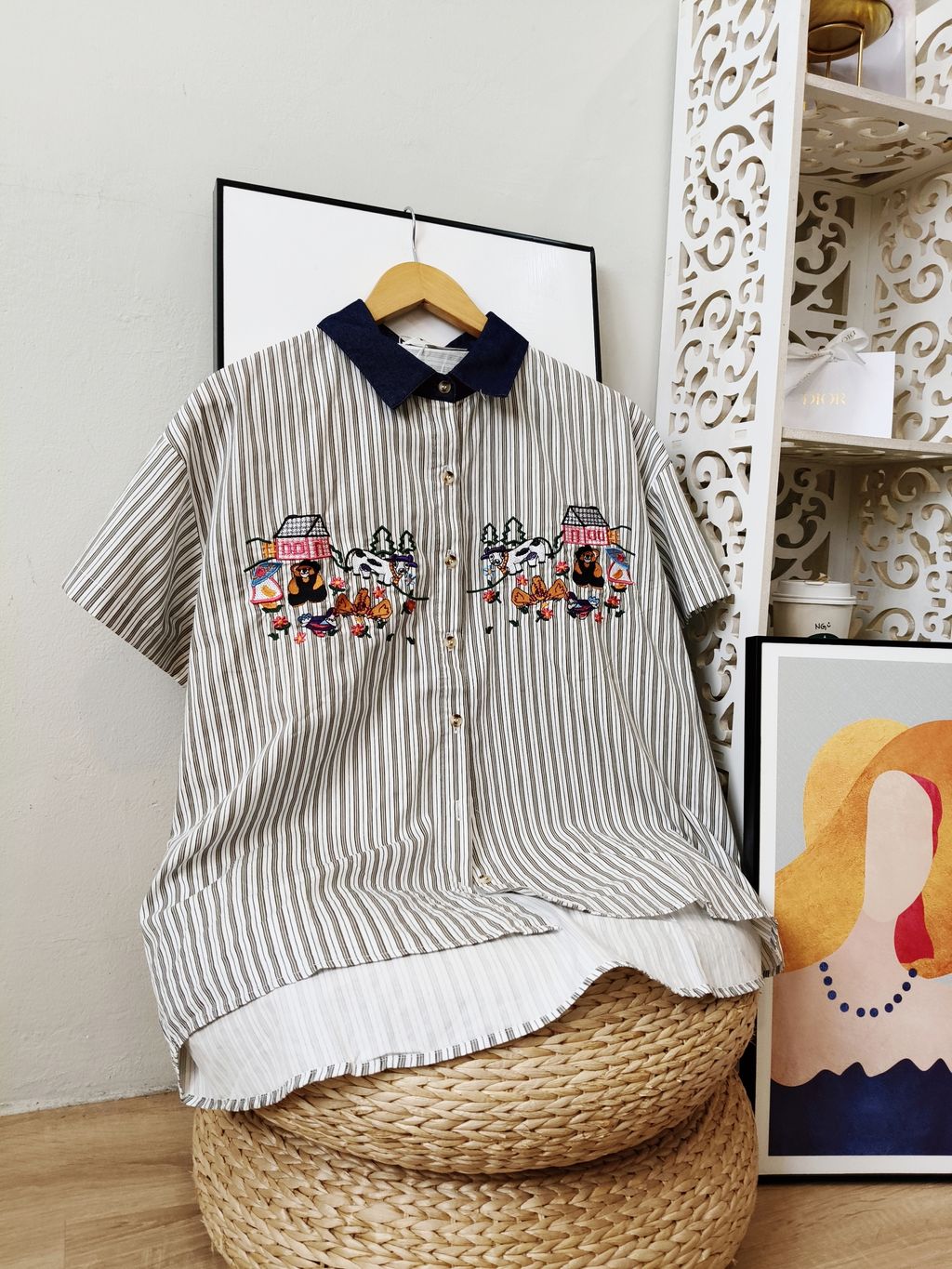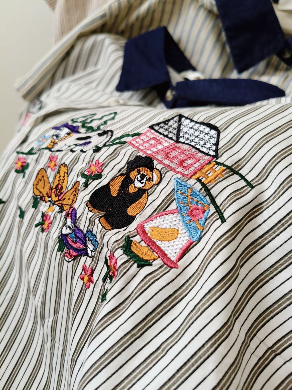 Embroidered Striped Patchwork Denim Collar Shirt 刺绣条纹拼接牛仔领口衬衫