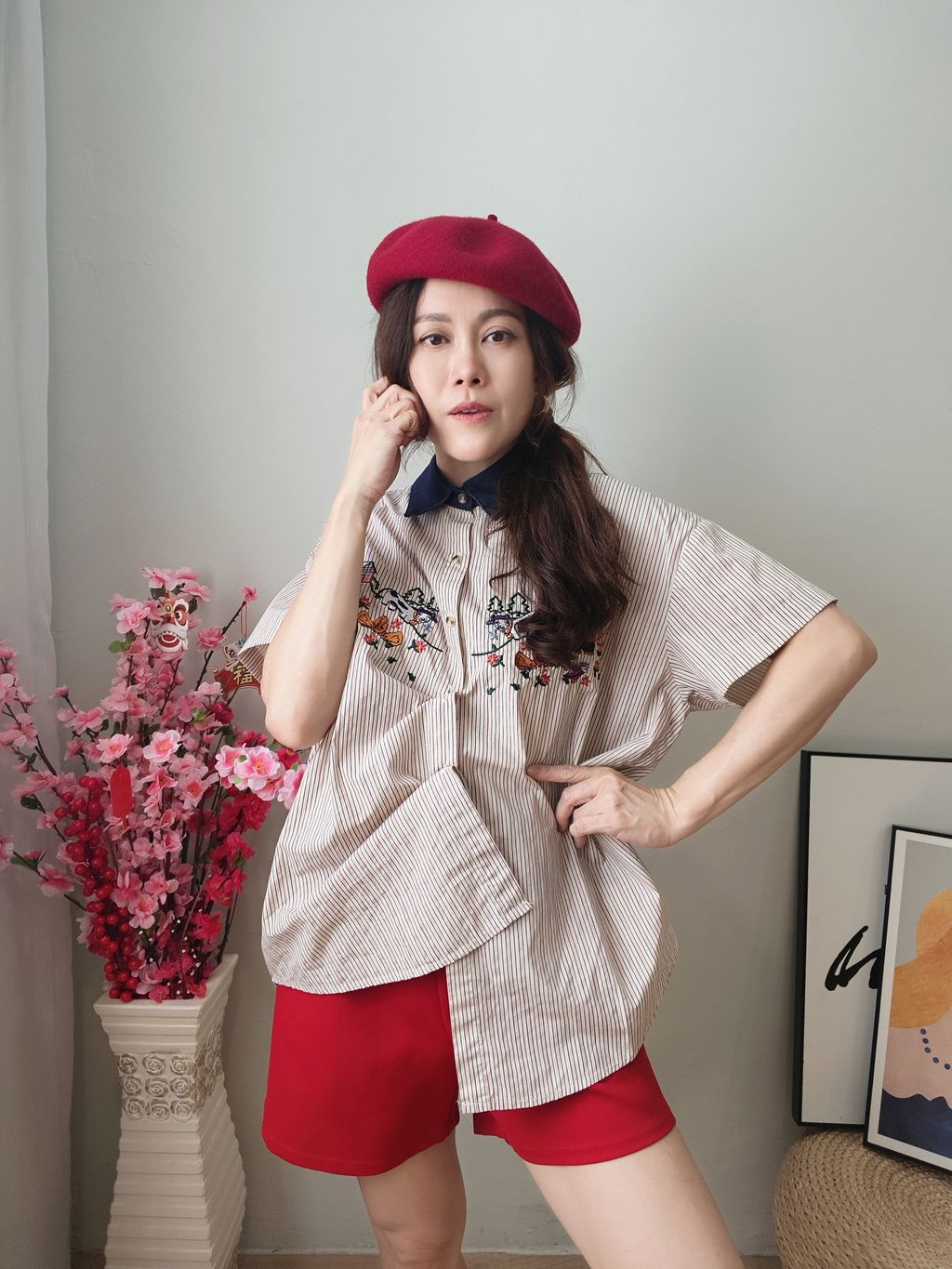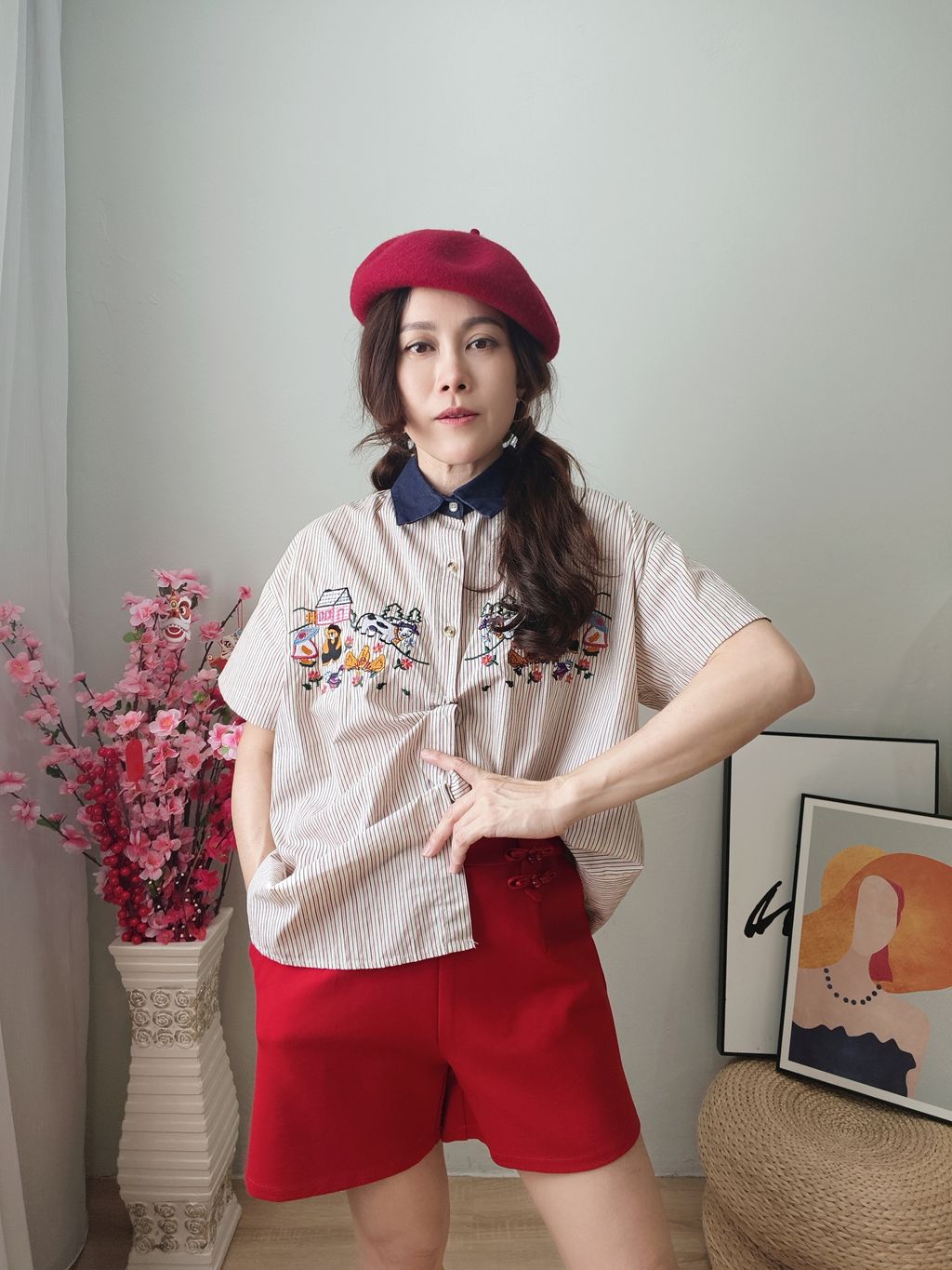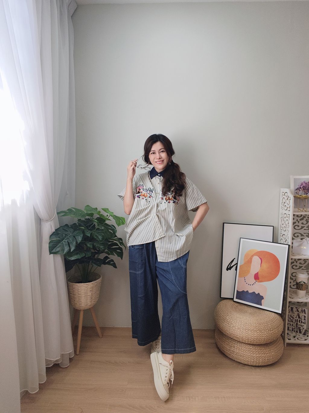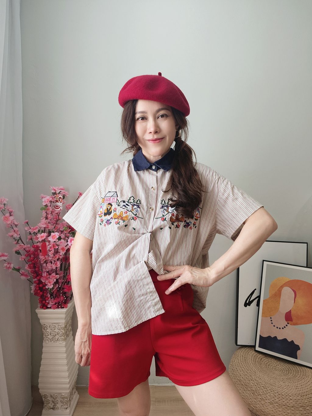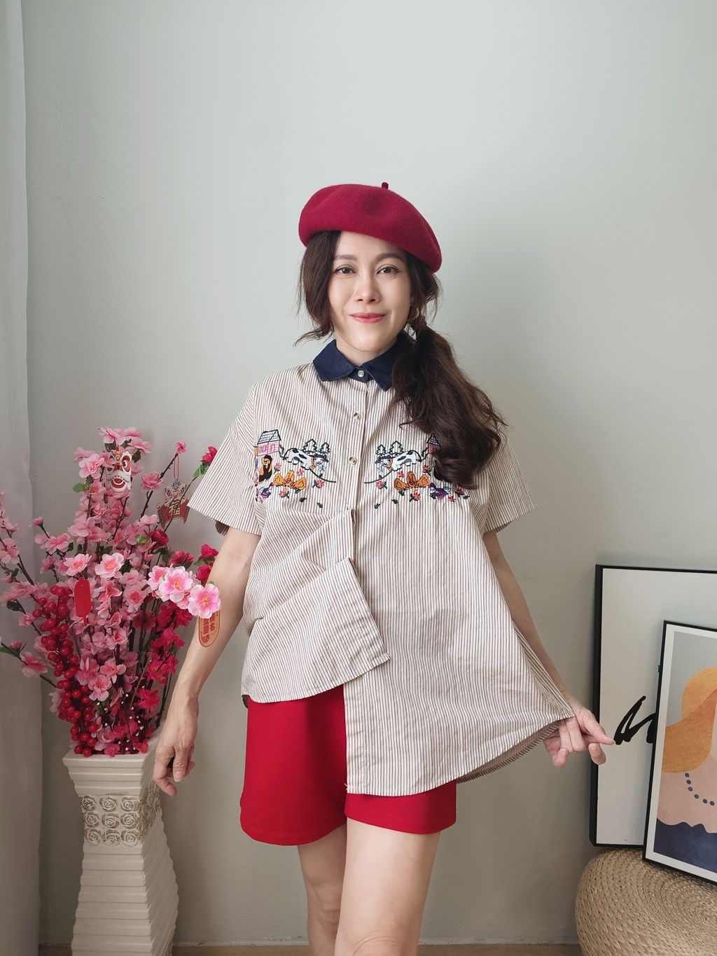 Embroidered Striped Patchwork Denim Collar Shirt 刺绣条纹拼接牛仔领口衬衫