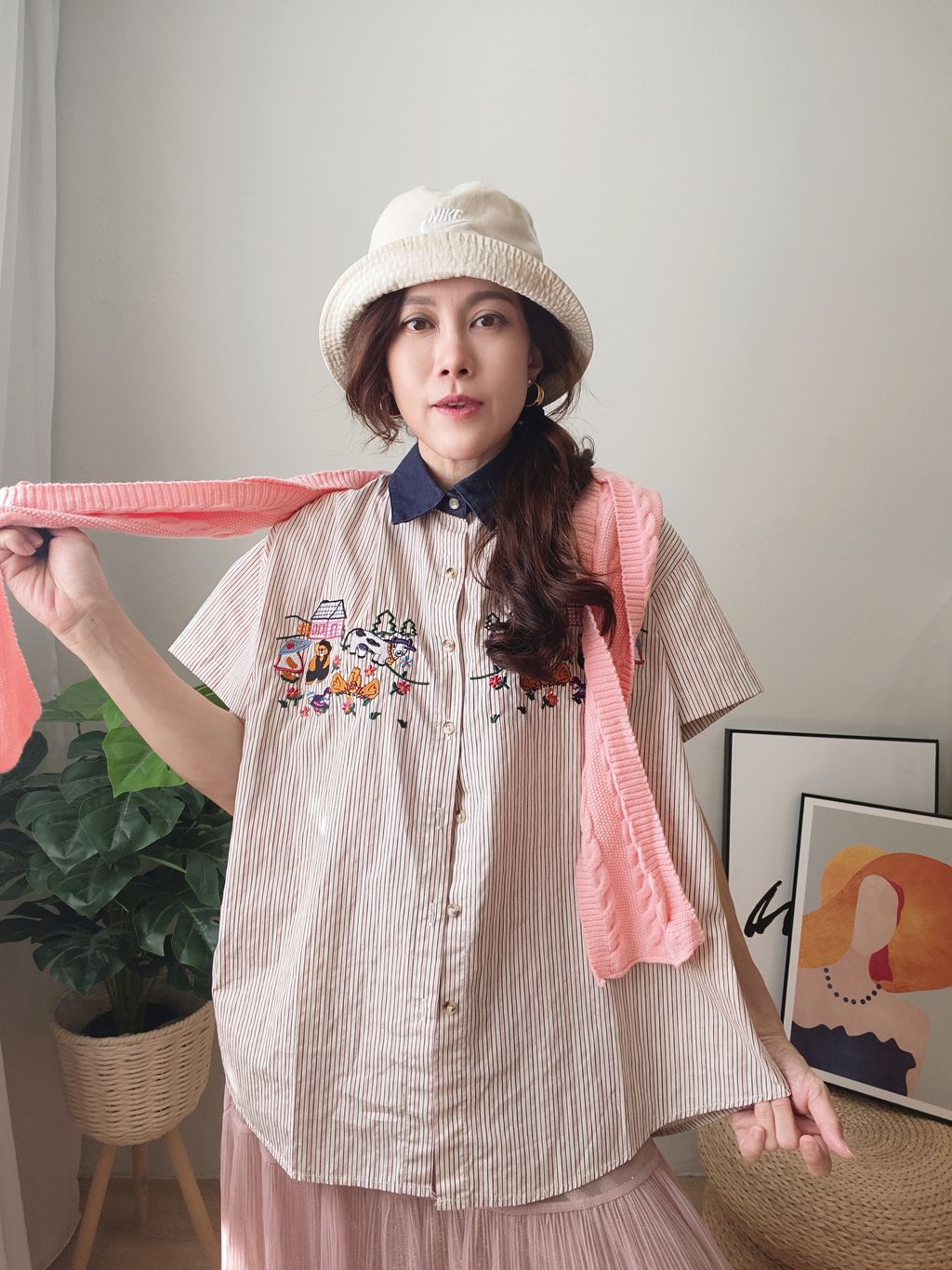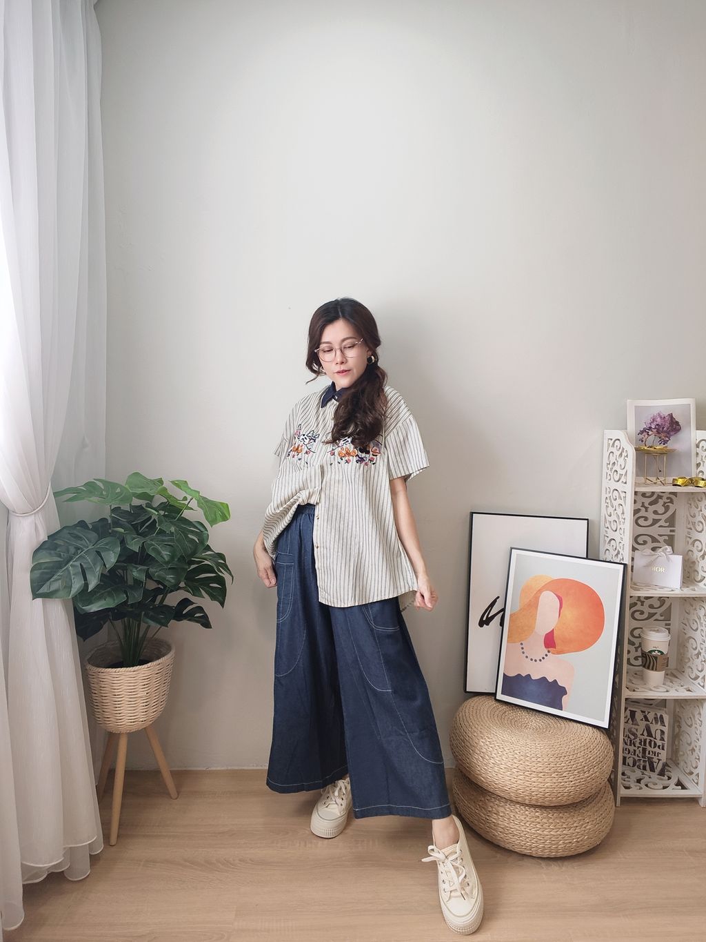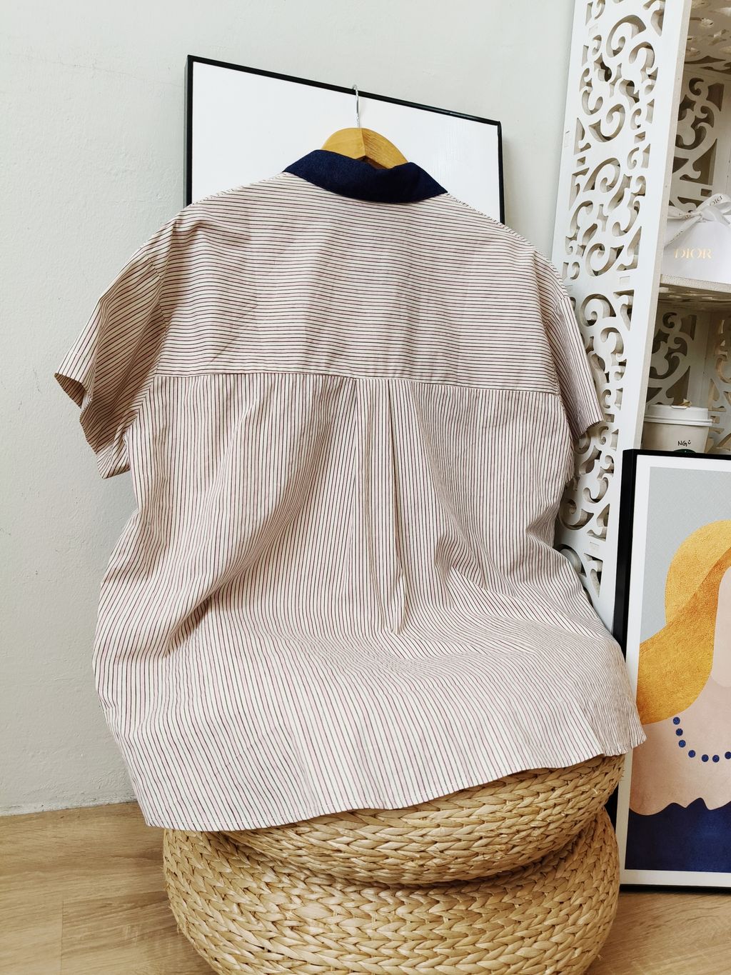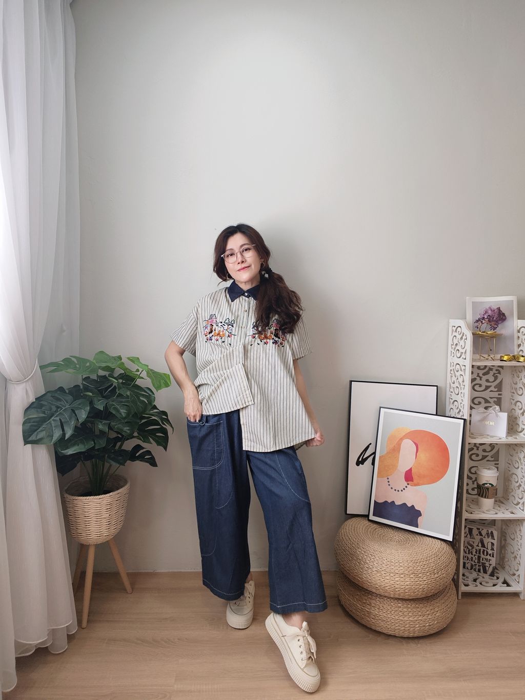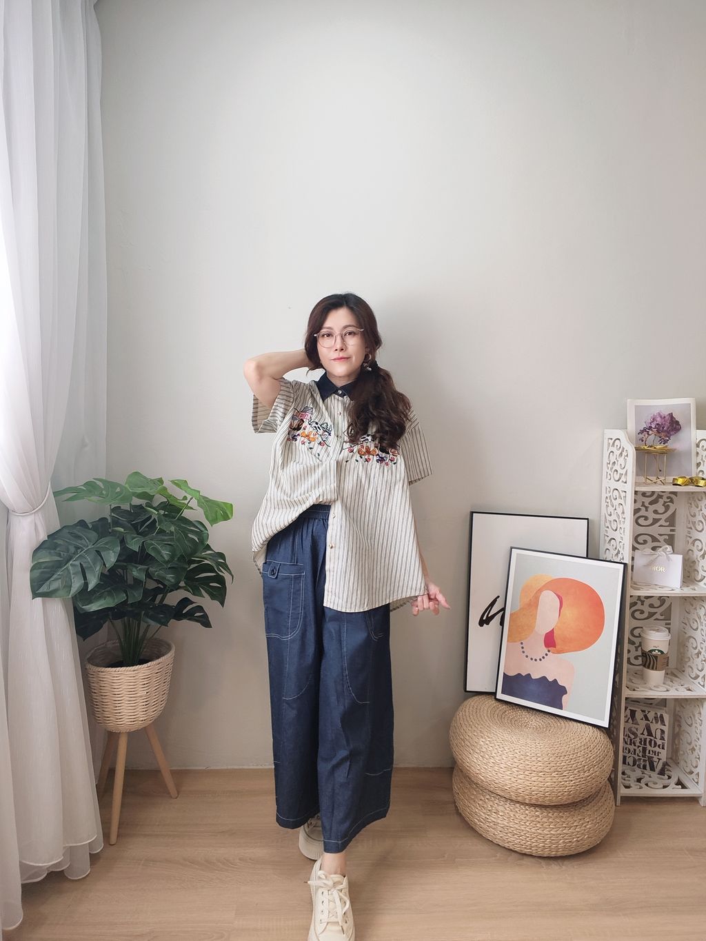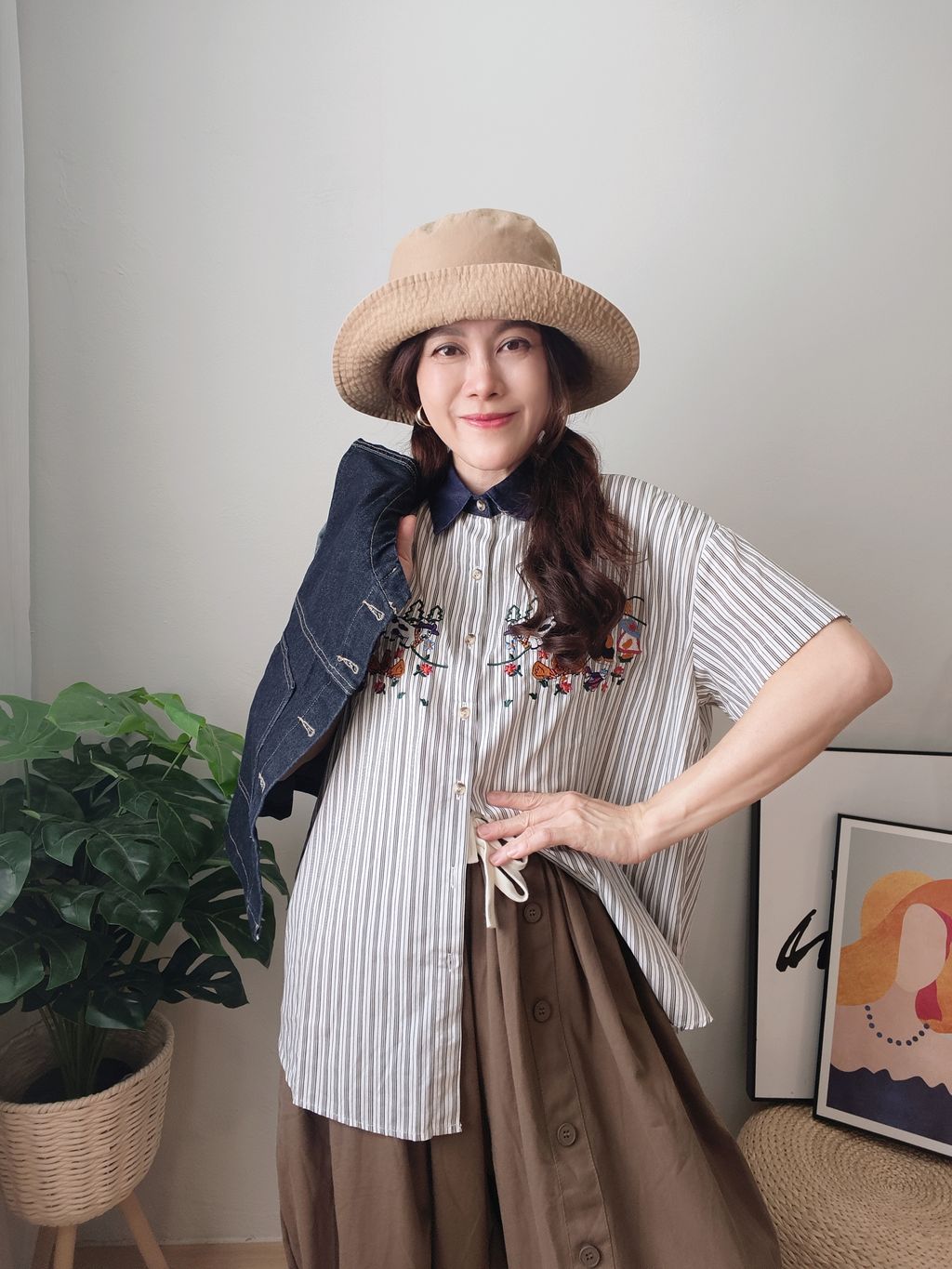 Embroidered Striped Patchwork Denim Collar Shirt 刺绣条纹拼接牛仔领口衬衫