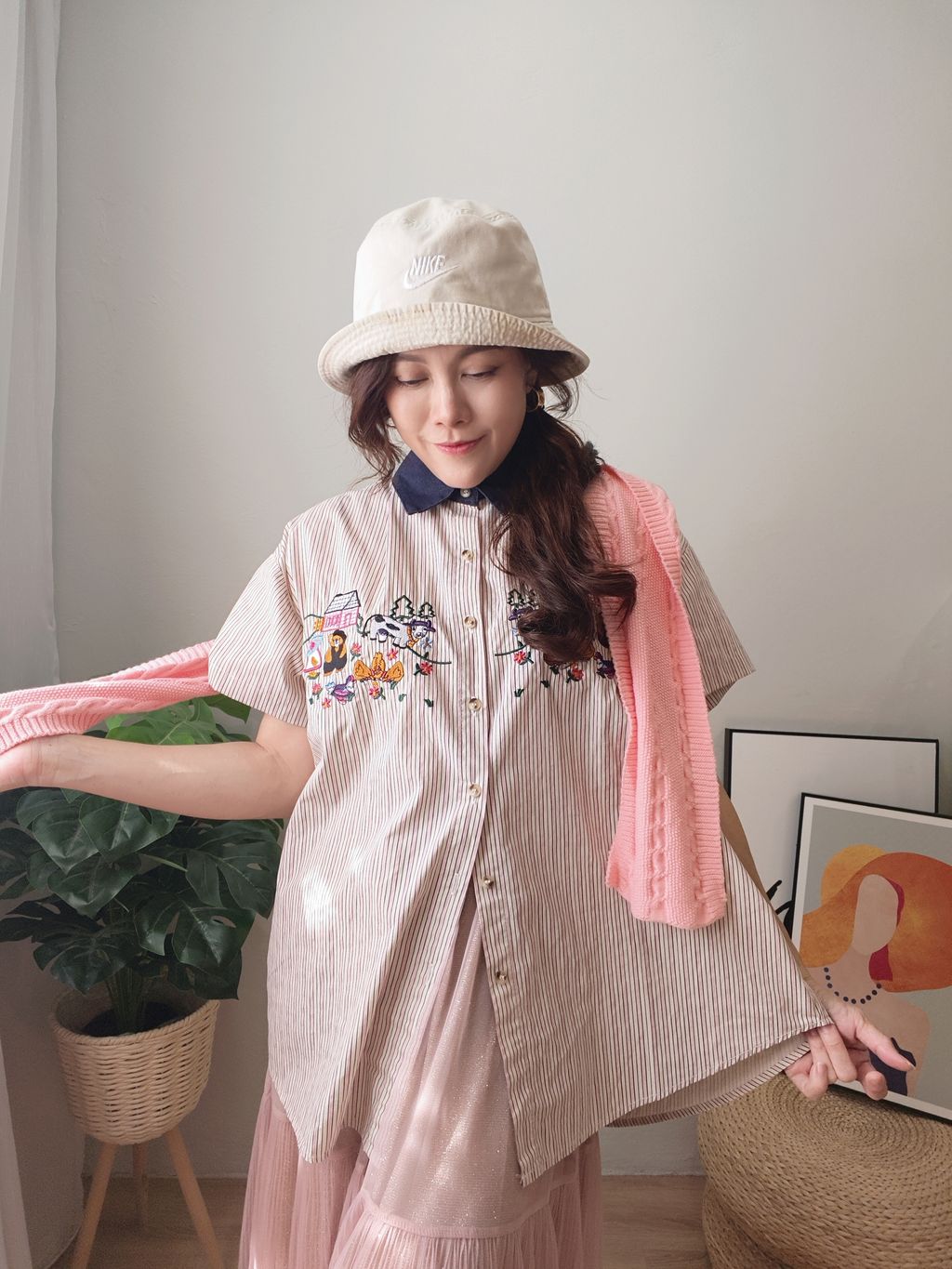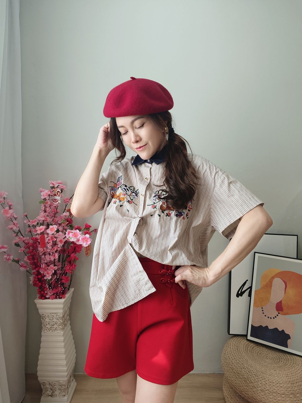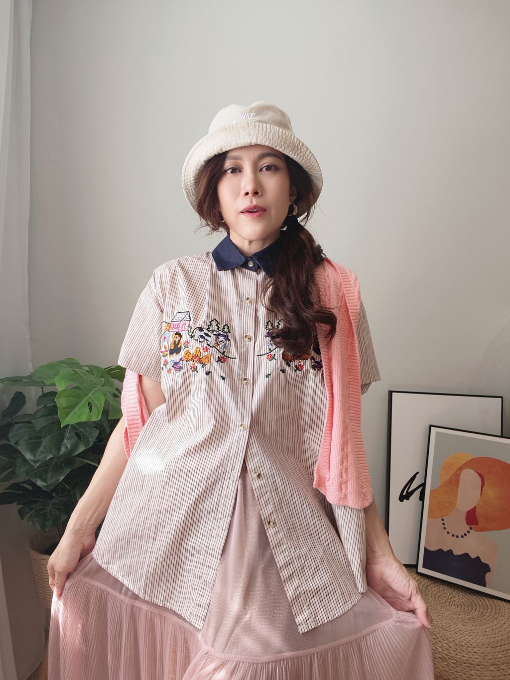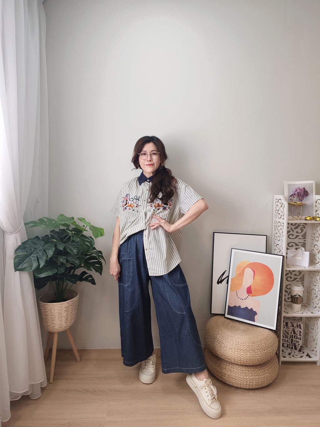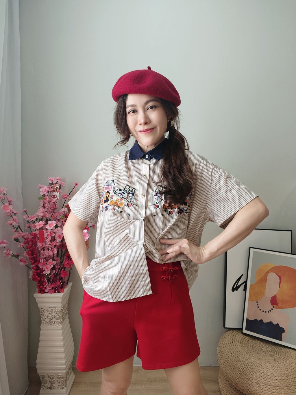 Embroidered Striped Patchwork Denim Collar Shirt 刺绣条纹拼接牛仔领口衬衫