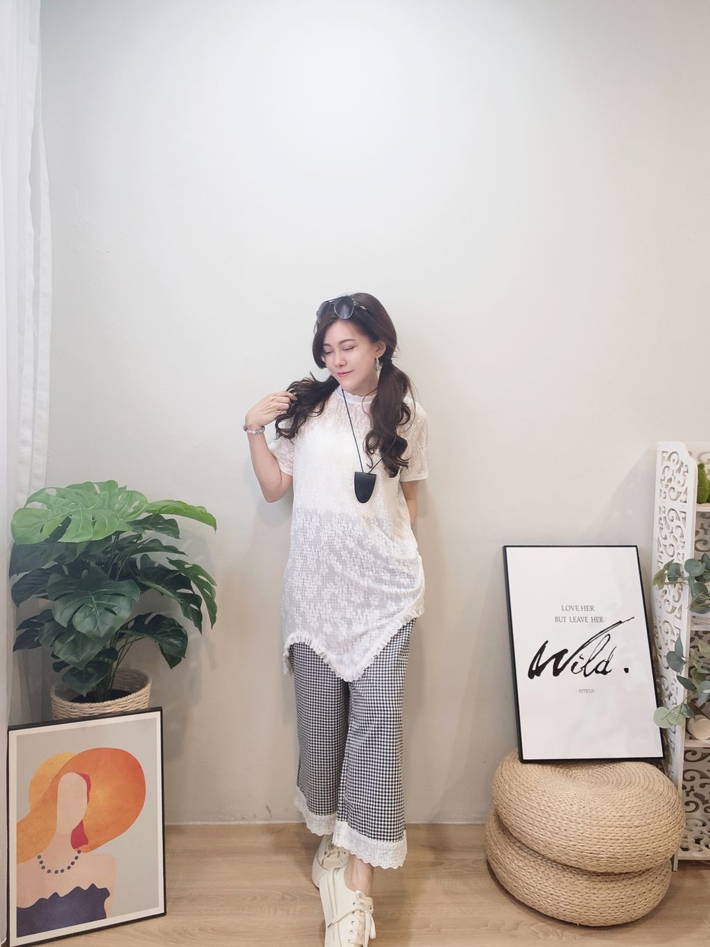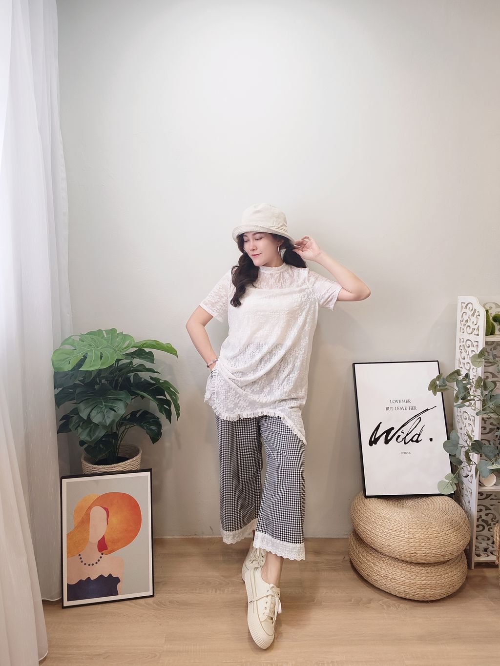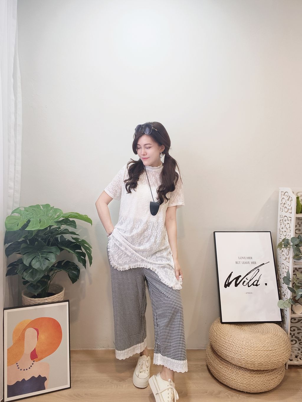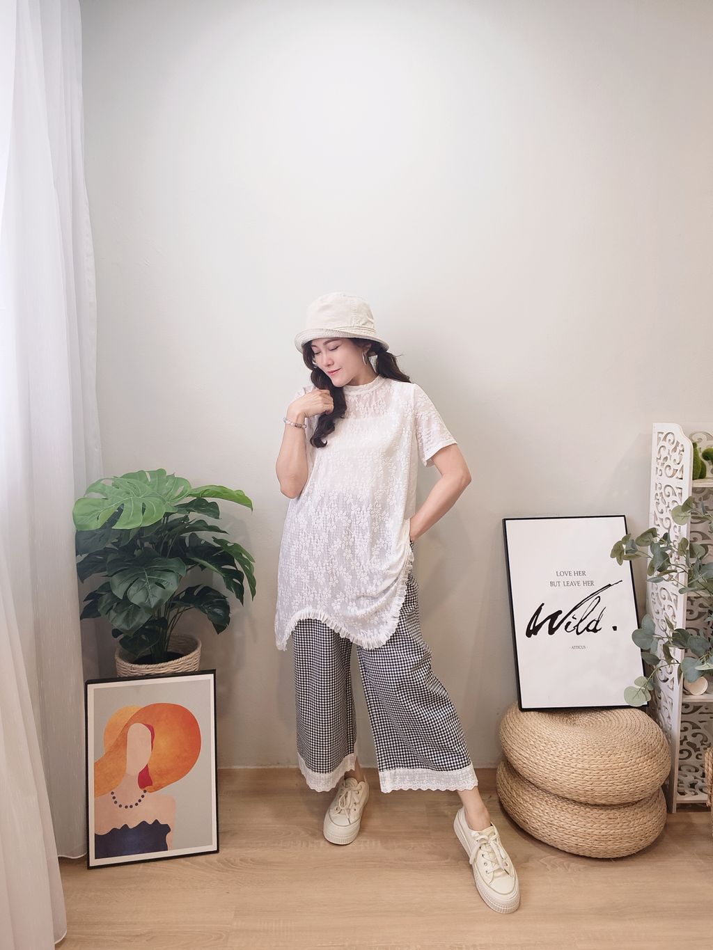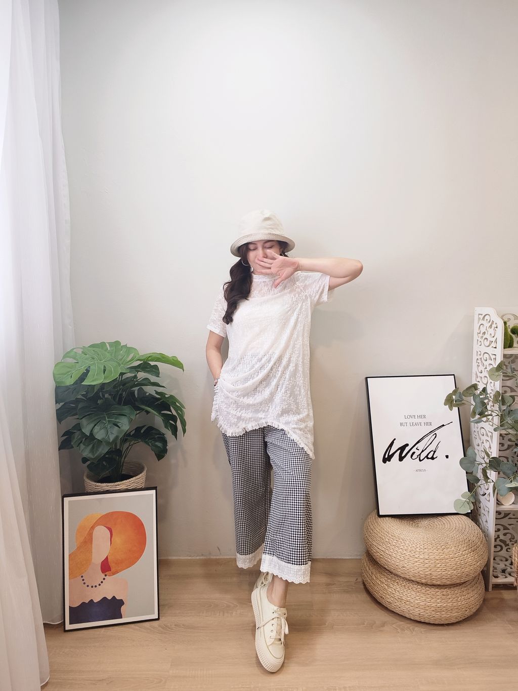 Material: Stretch Lace 弹力蕾丝 (上衣) + Linen 麻布 (裤子)